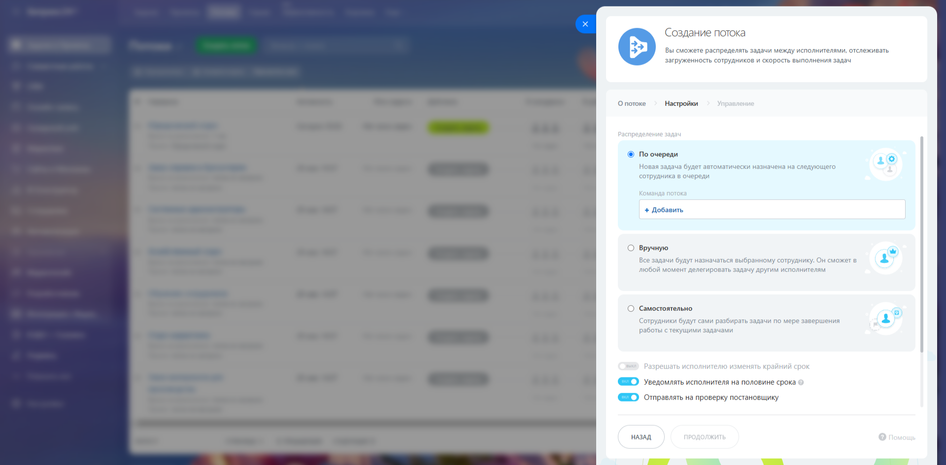 В Потоках Битрикс24 можно выбрать, как задачи будут назначаться сотрудникам: по очереди, вручную или самостоятельно. Способ распределения настраивается при создании Потока и при необходимости может быть изменен.