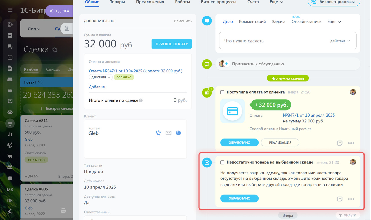 Если же на складе недостаточно товаров или услуги недоступны, закрыть сделку не получится. В таймлайне вы увидите предупреждение. Например, оно может сообщать: «Недостаточно товара на выбранном складе». Это значит, что в сделке указано больше товара, чем есть в наличии. В такой ситуации вы можете уменьшить количество или выбрать другой склад, где товара достаточно. Аналогично, если добавленная в сделку услуга недоступна, появится сообщение «Услуга недоступна для продажи».
