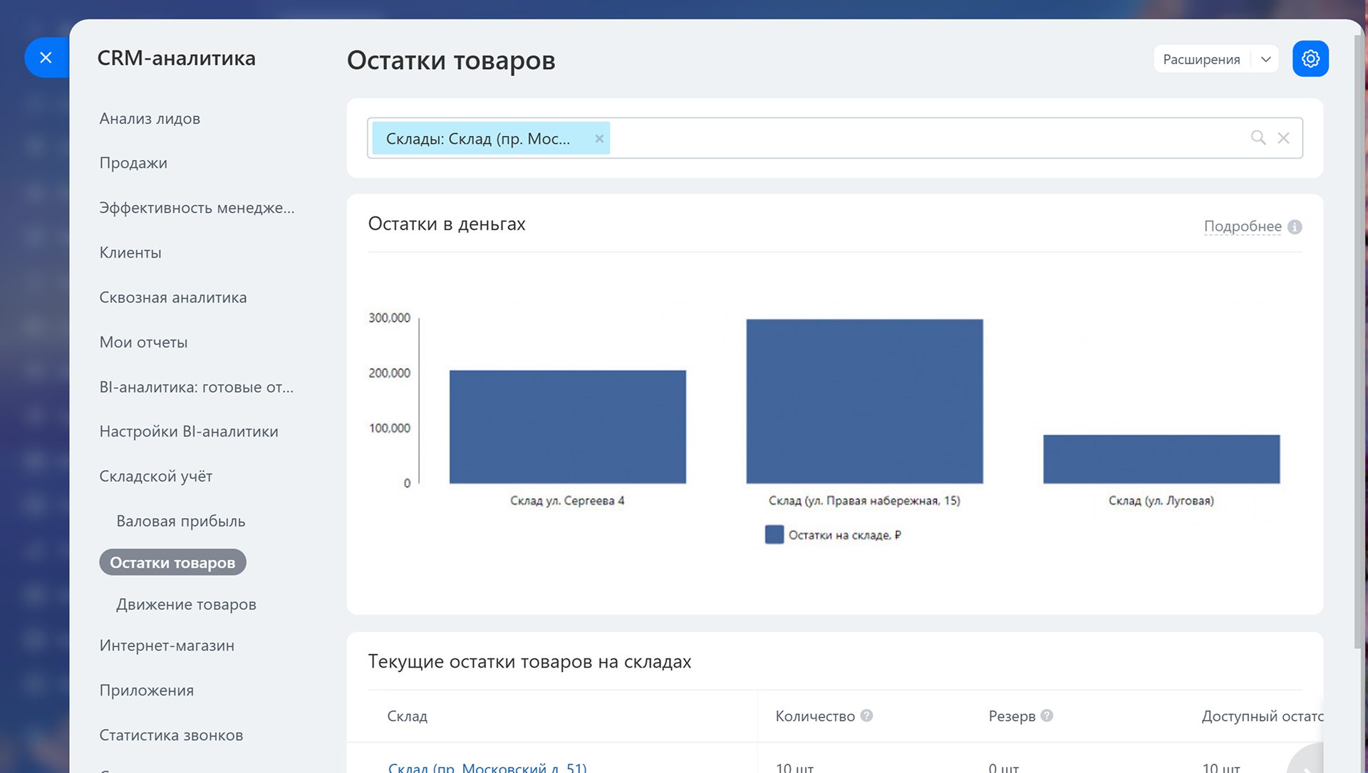 Складской учет — это раздел, с помощью которого вы видите всю информацию о товарах на вашем складе. Он показывает, сколько и каких товаров есть, где они находятся и как движутся.