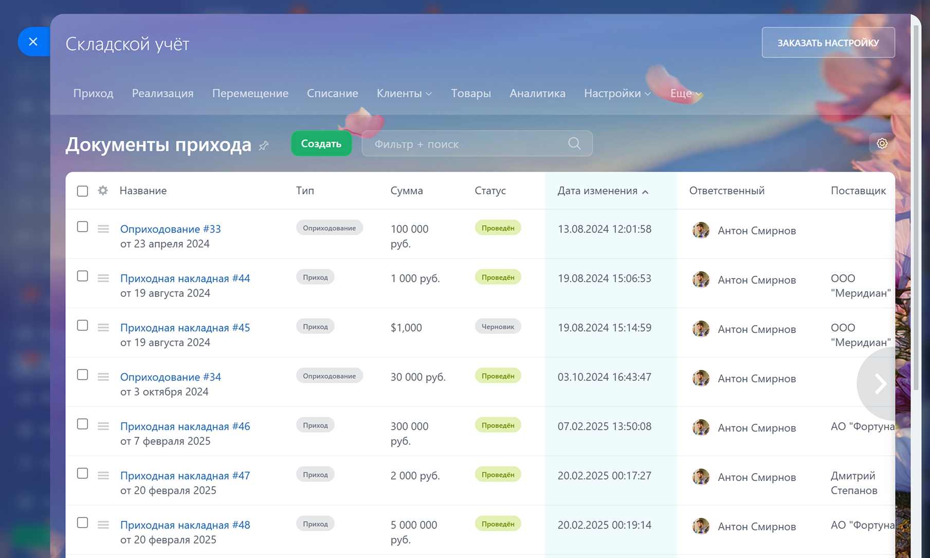 После этого создайте документ оприходования и внесите фактические остатки товаров. В документе укажите, на каком складе находится товар, количество, закупочную цену и другие параметры. Теперь товары будут доступны в едином каталоге, и вы сможете использовать их в работе со сделками и заказами.